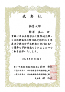 ■授与機関:日本金属学会北陸信越支部・日本鉄鋼協会北陸信越支部