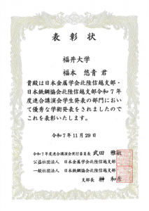 柿澤 真人さん(学部4年)、福本 悠青さん(学部4年)が日本金属学会北陸信越支部・日本鉄鋼協会北陸信越支部令和7年度連合講演会にて優秀発表賞を受賞しました。
