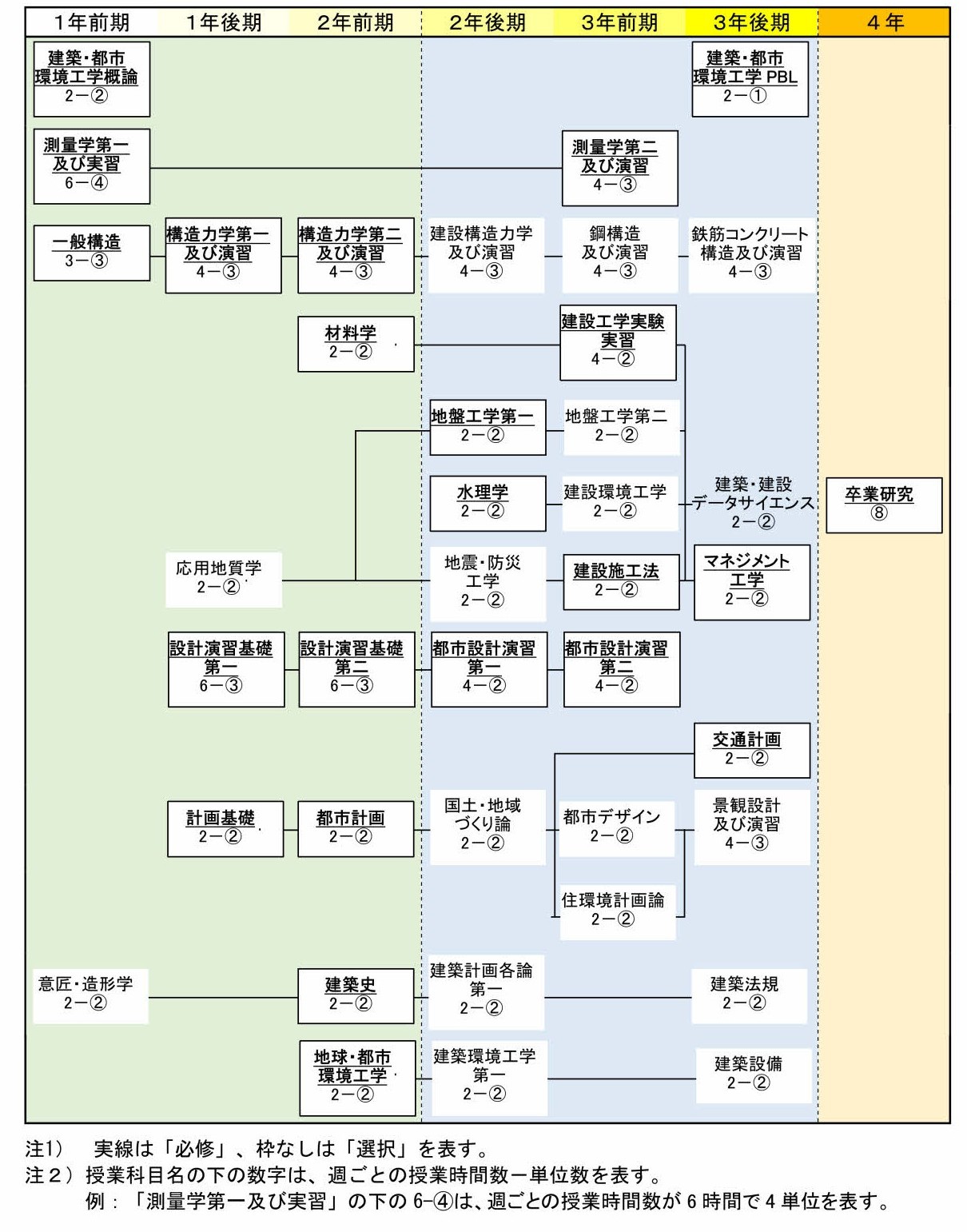 建築・都市環境工学科 都市環境工学コース HOME > 工学部 > 建築・都市環境工学科 > 都市環境工学コース 都市環境工学コースの目指す技術者像 建築・都市環境工学科では建築創造から国土形成に至るまで建築学と都市環境工学の両分野で貢献する人材を輩出します。 その中で、都市環境工学コースでは安全・安心で豊かな生活を支える社会基盤を保持し、さらに発展させるために、①両分野に係る基礎能力、②都市・環境工学分野に係る専門能力、③それらを応用でき実践力のある技術者を育成します。 都市環境工学コース専門科目のカリキュラムフロー 建築・都市環境工学科 トップページ 入学から卒業まで 研究・教員 非常勤講師 プロジェクト型教育 学習・教育到達目標 学科表彰者 大学院 コース紹介 建築学コース JABEE認定教育プログラム(建築学コース) 都市環境工学コース JABEE認定教育プログラム(都市環境工学コース) 受験生サイト ポリシー 就職支援と進路 取得できる資格