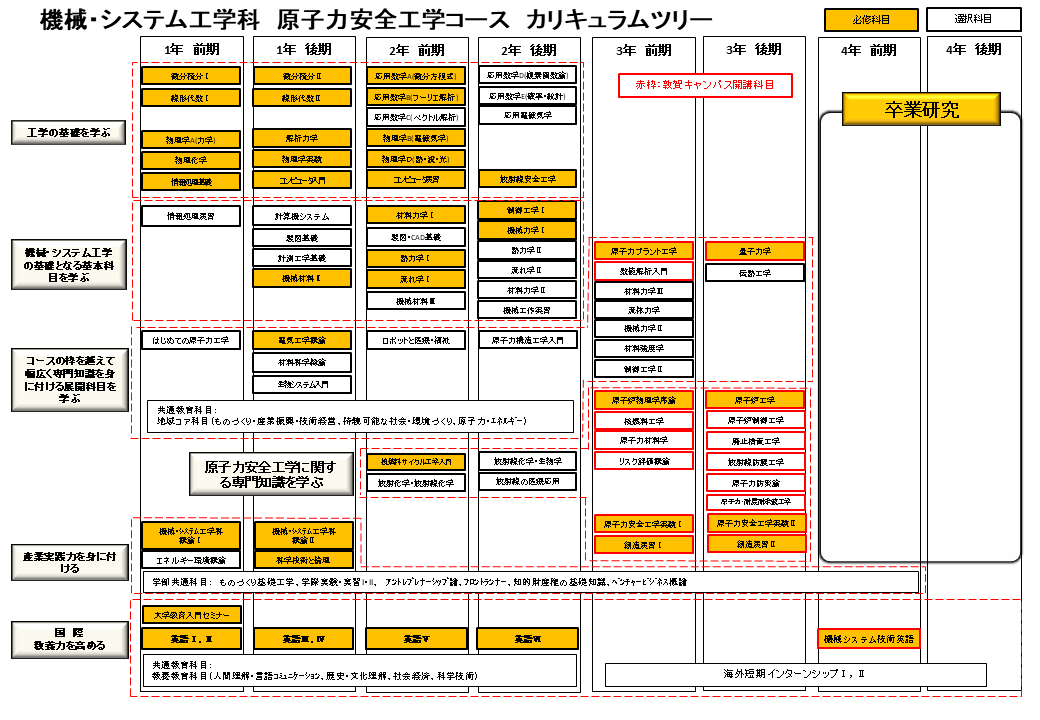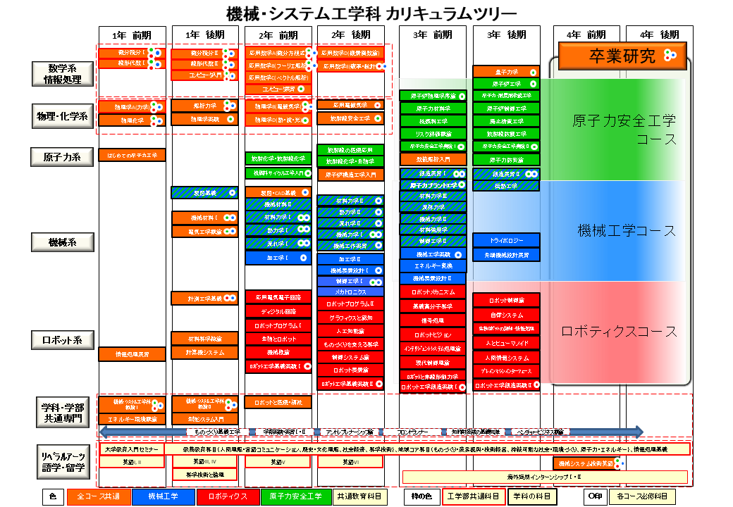 従来の機械工学の枠を越えて、総合工学としてのロボティクスと原子力工学における最先端の技術と知識を学び、未来のものづくりを支えるGlobal Imagineerになることを目指します。3コースに共通する科目によって、総合工学に必要な幅広い知識を身に付けるとともに、各コースの専門科目で、希望する学問分野に関する深い知識を身に付けることができます。