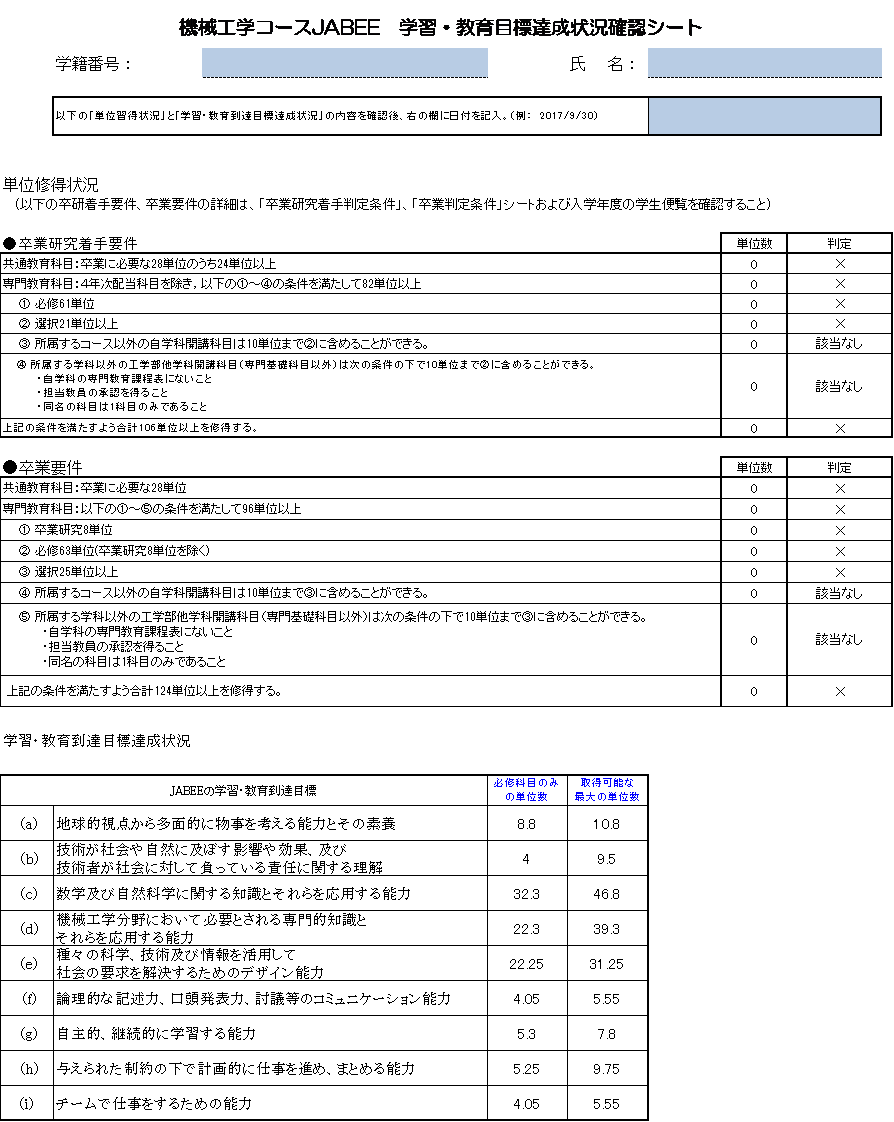 本コースでは、「単位取得状況確認表」を用いた、学生自身による JABEEの学習・教育目標達成状況の自己点検も行っています。
